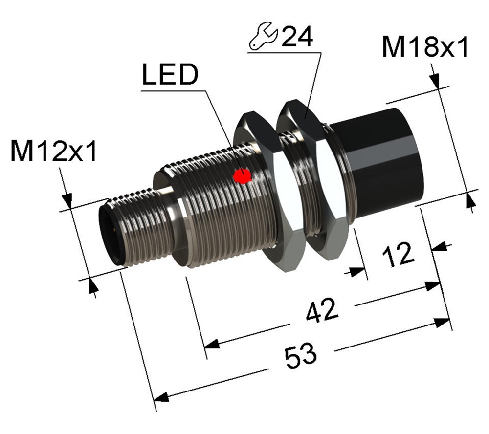 Индуктивный бесконтактный датчик в цилиндрическом латунном корпусе с резьбой М18х1 длиной 53 мм. В комплекте две крепежные гайки.
