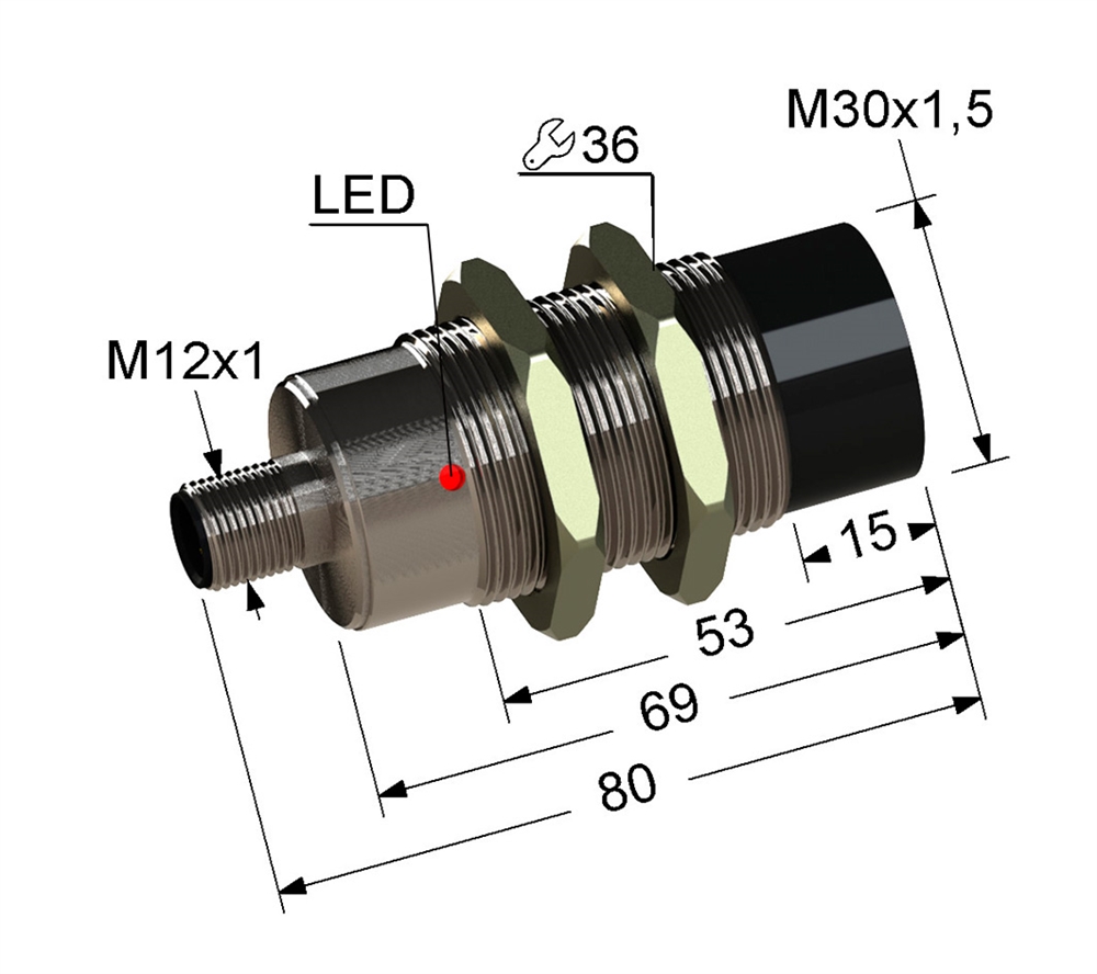 Индуктивный бесконтактный датчик в цилиндрическом латунном корпусе с резьбой М30х1,5 длиной 80 мм. В комплекте две крепежные гайки.