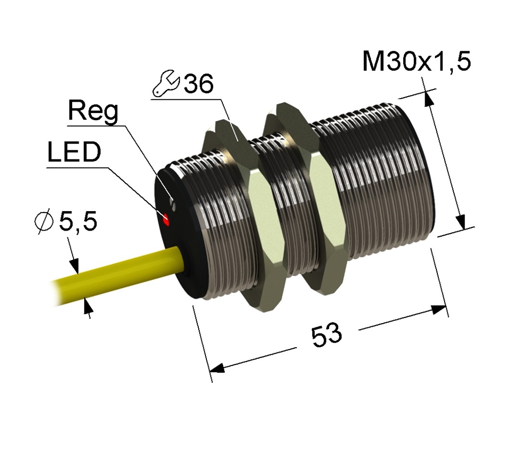 Емкостный бесконтактный датчик в цилиндрическом латунном корпусе с резьбой М30х1,5 длиной 53 мм. В комплекте две крепежные гайки.