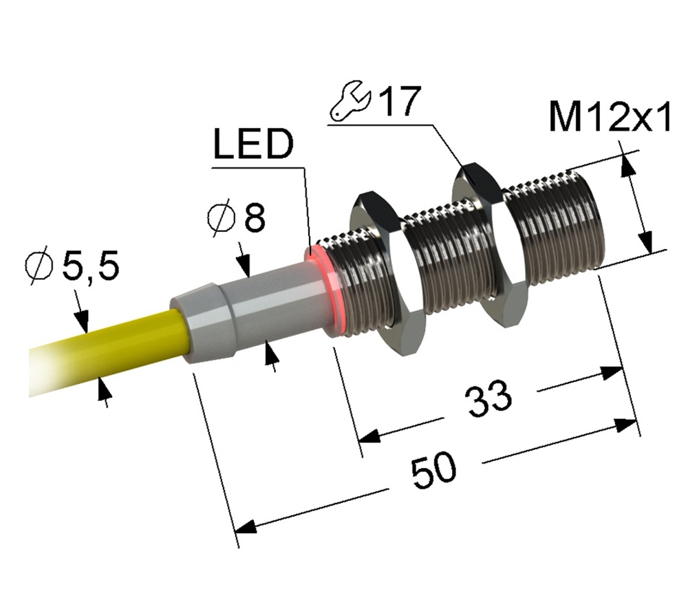 Индуктивный бесконтактный датчик в цилиндрическом латунном корпусе с резьбой М12х1 длиной 50 мм. В комплекте две крепежные гайки.