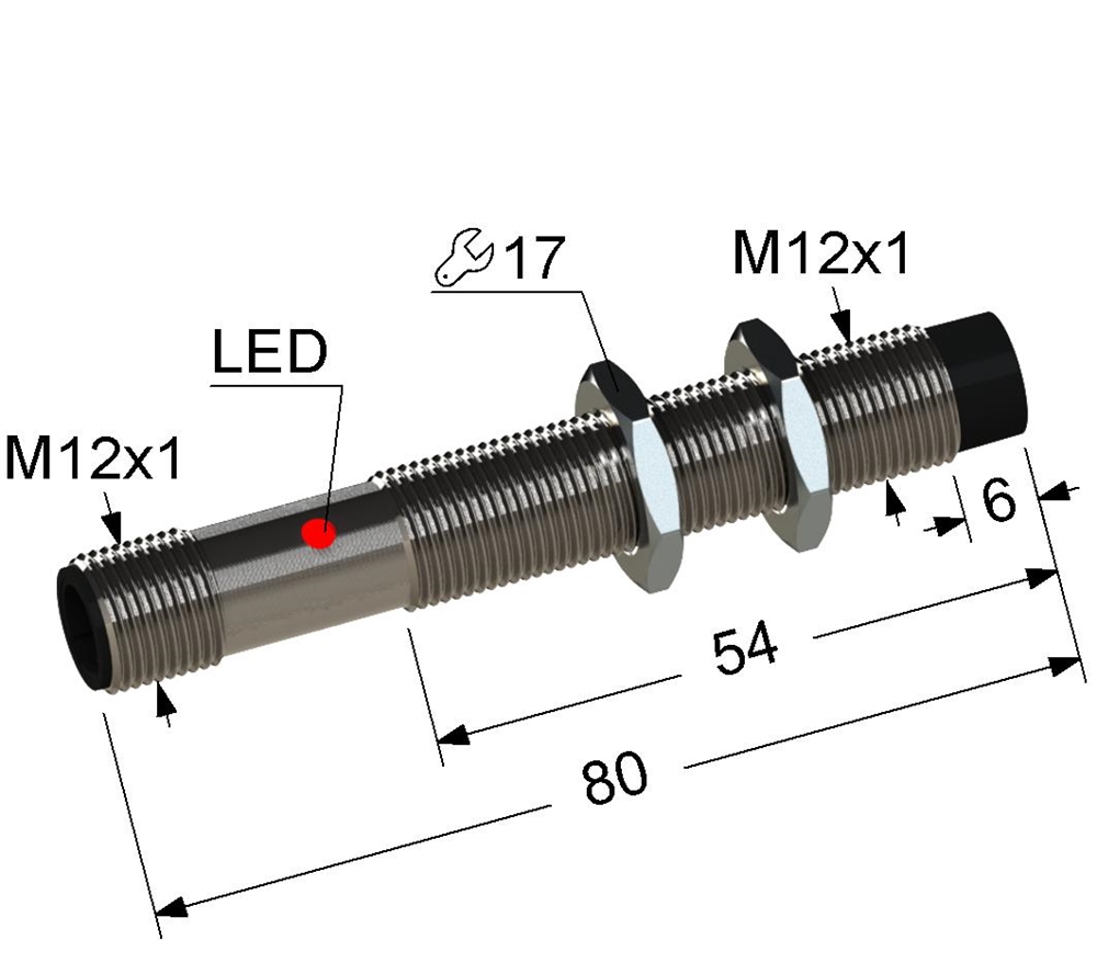 Индуктивный бесконтактный датчик в цилиндрическом латунном корпусе с резьбой М12х1 длиной 80 мм. В комплекте две крепежные гайки.