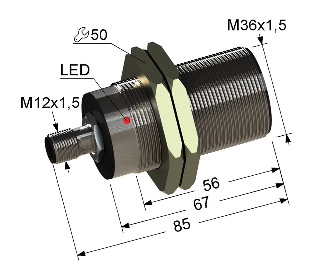 Индуктивный бесконтактный датчик в цилиндрическом латунном корпусе с резьбой М36х1,5 длиной 85 мм. В комплекте две крепежные гайки.