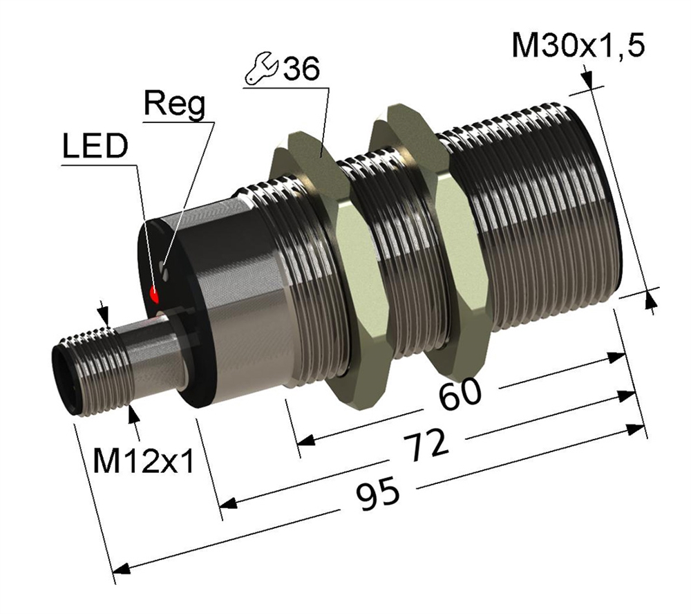 Индуктивный бесконтактный датчик пороговой частоты в цилиндрическом латунном корпусе с резьбой M30x1,5 длиной 95 мм. В комплекте две крепежные гайки.