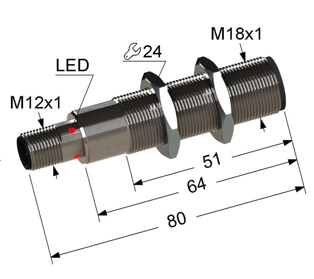 Миниатюрный корпус из пластика АБС и латуни с резьбой М18х1 длиной 80 мм. Может быть настроен на размыкание или замыкание ключа. Тип Т. Барьерный.